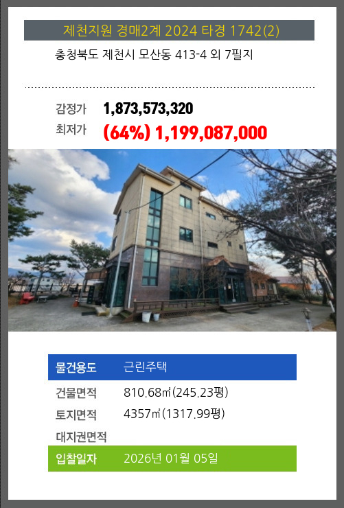 사건번호 2024 타경 1742(2) 본건은 충청북도 제천시 모산동 413-4 외 7필지소재하는 근린주택경매 물건의 포스팅입니다. 건물면적 [ 810.68㎡ (245.23평) ]토지면적 [ 4357㎡ (1317.99평) ] 시세를 반영한