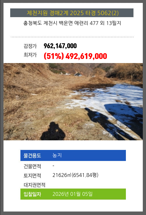 사건번호 2025 타경 5062(2) 본건은 충청북도 제천시 백운면 애련리 477 외 13필지소재하는 농지경매 물건의 포스팅입니다. 토지면적 [ 21626㎡ (6541.84평) ] 시세를 반영한 감정가 962,147,000에서3회 유찰되어
