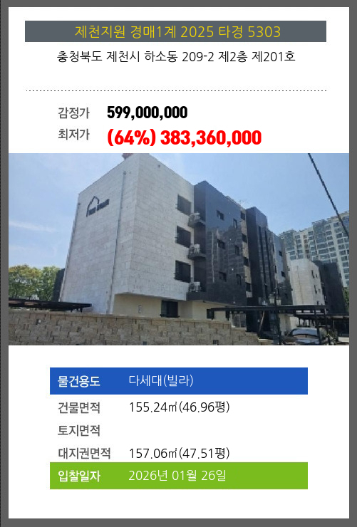 사건번호 2025 타경 5303 본건은 충청북도 제천시 하소동 209-2 제2층 제201호소재하는 다세대(빌라)경매 물건의 포스팅입니다. 건물면적 [ 155.24㎡ (46.96평) ]대지권 [ 157.06㎡ (47.51평) ] 시세를 반영한