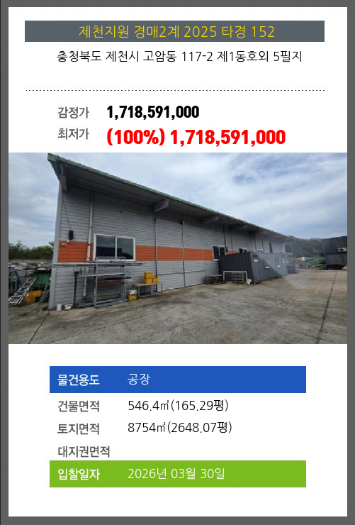 사건번호 2025 타경 152 본건은 충청북도 제천시 고암동 117-2 제1동호외 5필지소재하는 공장경매 물건의 포스팅입니다. 건물면적 [ 546.4㎡ (165.29평) ]토지면적 [ 8754㎡ (2648.07평) ] 시세를 반영한