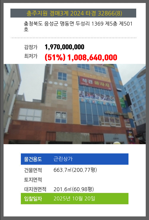 사건번호 2024 타경 32866(8) 본건은 충청북도 음성군 맹동면 두성리 1369 제5층 제501호소재하는 근린상가경매 물건의 포스팅입니다. 건물면적 [ 663.7㎡ (200.77평) ]대지권 [ 201.6㎡ (60.98평) ] 시세를