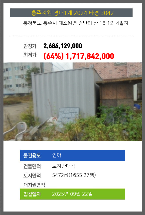 사건번호 2024 타경 3042 본건은 충청북도 충주시 대소원면 검단리 산 16-1외 4필지소재하는 임야경매 물건의 포스팅입니다. 건물면적 [ 토지만매각 ]토지면적 [ 5472㎡ (1655.27평) ] 시세를 반영한