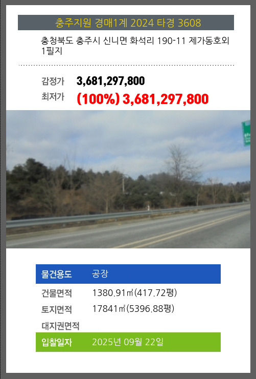사건번호 2024 타경 3608 본건은 충청북도 충주시 신니면 화석리 190-11 제가동호외 1필지소재하는 공장경매 물건의 포스팅입니다. 건물면적 [ 1380.91㎡ (417.72평) ]토지면적 [ 17841㎡ (5396.88평) ] 시세를