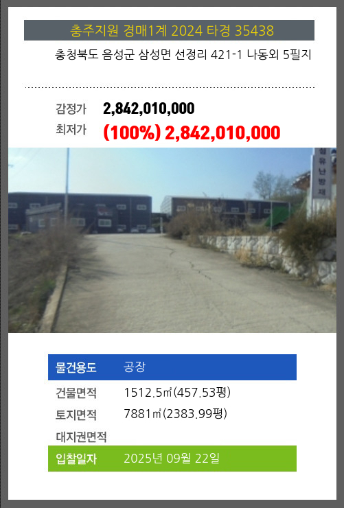 사건번호 2024 타경 35438 본건은 충청북도 음성군 삼성면 선정리 421-1 나동외 5필지소재하는 공장경매 물건의 포스팅입니다. 건물면적 [ 1512.5㎡ (457.53평) ]토지면적 [ 7881㎡ (2383.99평) ] 시세를