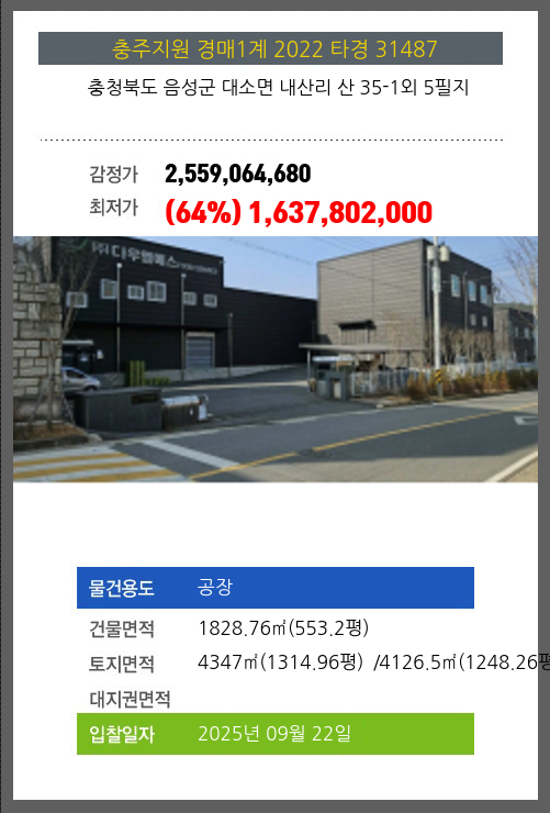 사건번호 2022 타경 31487 본건은 충청북도 음성군 대소면 내산리 산 35-1외 5필지소재하는 공장경매 물건의 포스팅입니다. 건물면적 [ 1828.76㎡ (553.2평) ]토지면적 [ 전체:4347㎡ (1314.96평) 매각지분:4126.5㎡ (1248.26평)