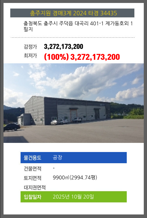 사건번호 2024 타경 34435 본건은 충청북도 충주시 주덕읍 대곡리 401-1 제가동호외 1필지소재하는 공장경매 물건의 포스팅입니다. 토지면적 [ 9900㎡ (2994.74평) ] 시세를 반영한 감정가 3,272,173,200에서신건으로 감정가
