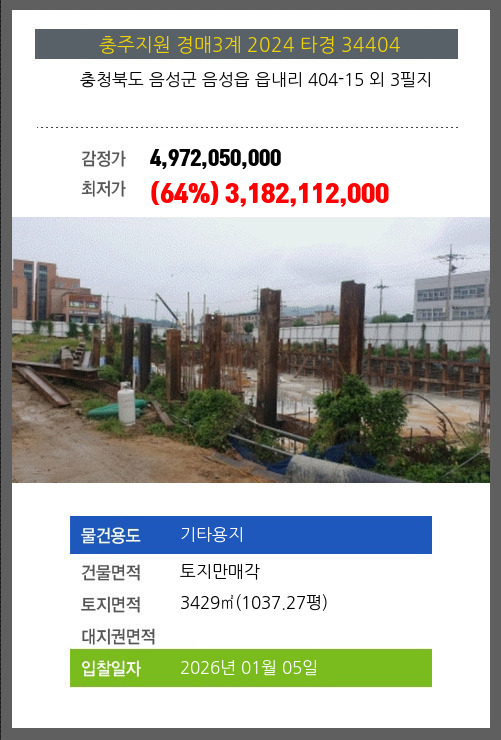 사건번호 2024 타경 34404 본건은 충청북도 음성군 음성읍 읍내리 404-15 외 3필지소재하는 기타용지경매 물건의 포스팅입니다. 건물면적 [ 토지만매각 ]토지면적 [ 3429㎡ (1037.27평) ] 시세를 반영한