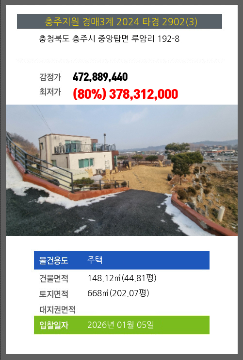 사건번호 2024 타경 2902(3) 본건은 충청북도 충주시 중앙탑면 루암리 192-8소재하는 주택경매 물건의 포스팅입니다. 건물면적 [ 148.12㎡ (44.81평) ]토지면적 [ 668㎡ (202.07평) ] 시세를 반영한 감정가