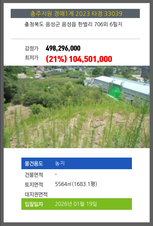 사건번호 2023 타경 33039 본건은 충청북도 음성군 음성읍 한벌리 706외 6필지소재하는 농지경매 물건의 포스팅입니다. 토지면적 [ 5564㎡ (1683.1평) ] 시세를 반영한 감정가 498,296,000에서4회 유찰되어 감정가
