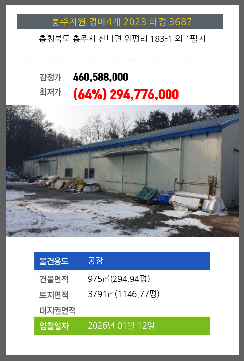 사건번호 2023 타경 3687 본건은 충청북도 충주시 신니면 원평리 183-1 외 1필지소재하는 공장경매 물건의 포스팅입니다. 건물면적 [ 975㎡ (294.94평) ]토지면적 [ 3791㎡ (1146.77평) ] 시세를