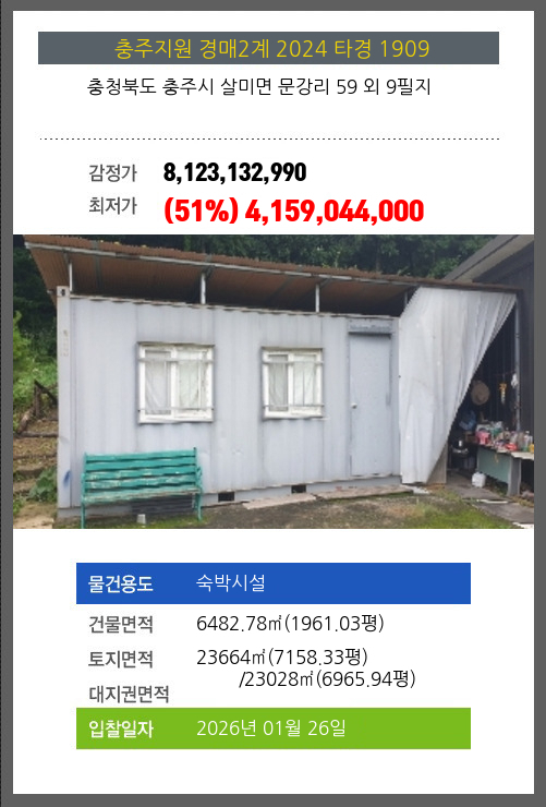사건번호 2024 타경 1909 본건은 충청북도 충주시 살미면 문강리 59 외 9필지소재하는 숙박시설경매 물건의 포스팅입니다. 건물면적 [ 6482.78㎡ (1961.03평) ]토지면적 [ 전체:23664㎡ (7158.33평) 매각지분:23028㎡ (6965.94평)