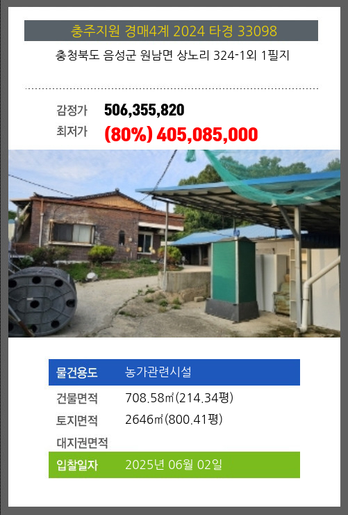 사건번호 2024 타경 33098 본건은 충청북도 음성군 원남면 상노리 324-1외 1필지소재하는 농가관련시설경매 물건의 포스팅입니다. 건물면적 [ 708.58㎡ (214.34평) ]토지면적 [ 2646㎡ (800.41평) ] 시세를 반영한