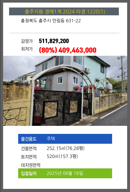 사건번호 2024 타경 1220(1) 본건은 충청북도 충주시 안림동 631-22소재하는 주택경매 물건의 포스팅입니다. 건물면적 [ 252.15㎡ (76.28평) ]토지면적 [ 520㎡ (157.3평) ] 시세를 반영한 감정가 511,829,200에서1회
