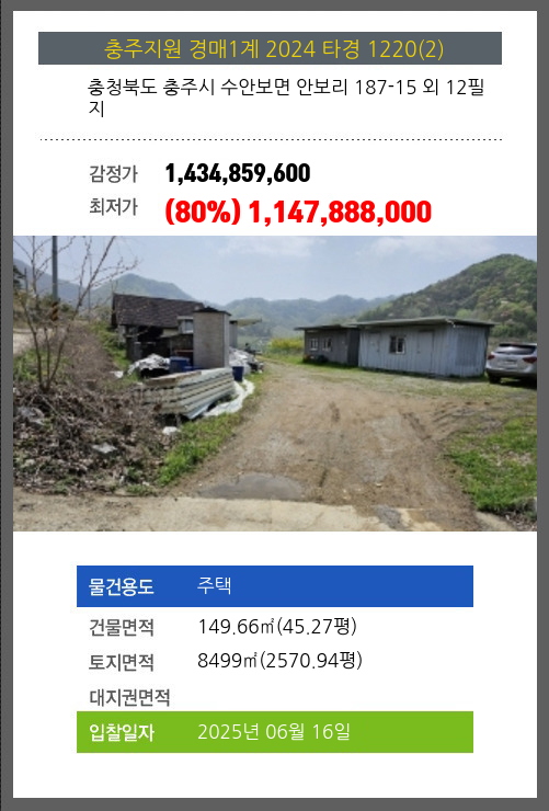 사건번호 2024 타경 1220(2) 본건은 충청북도 충주시 수안보면 안보리 187-15 외 12필지소재하는 주택경매 물건의 포스팅입니다. 건물면적 [ 149.66㎡ (45.27평) ]토지면적 [ 8499㎡ (2570.94평) ] 시세를