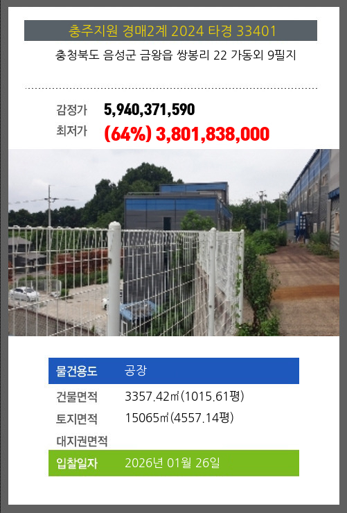 사건번호 2024 타경 33401 본건은 충청북도 음성군 금왕읍 쌍봉리 22 가동외 9필지소재하는 공장경매 물건의 포스팅입니다. 건물면적 [ 3357.42㎡ (1015.61평) ]토지면적 [ 15065㎡ (4557.14평) ] 시세를