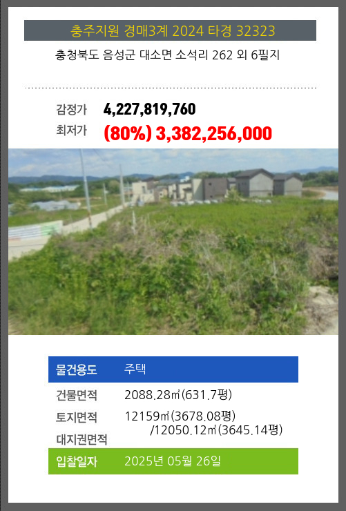 사건번호 2024 타경 32323 본건은 충청북도 음성군 대소면 소석리 262 외 6필지소재하는 주택경매 물건의 포스팅입니다. 건물면적 [ 2088.28㎡ (631.7평) ]토지면적 [ 전체:12159㎡ (3678.08평) 매각지분:12050.12㎡ (3645.14평)