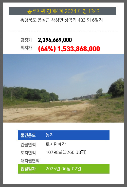 사건번호 2024 타경 1343 본건은 충청북도 음성군 삼성면 상곡리 483 외 6필지소재하는 농지경매 물건의 포스팅입니다. 건물면적 [ 토지만매각 ]토지면적 [ 10798㎡ (3266.38평) ] 시세를 반영한