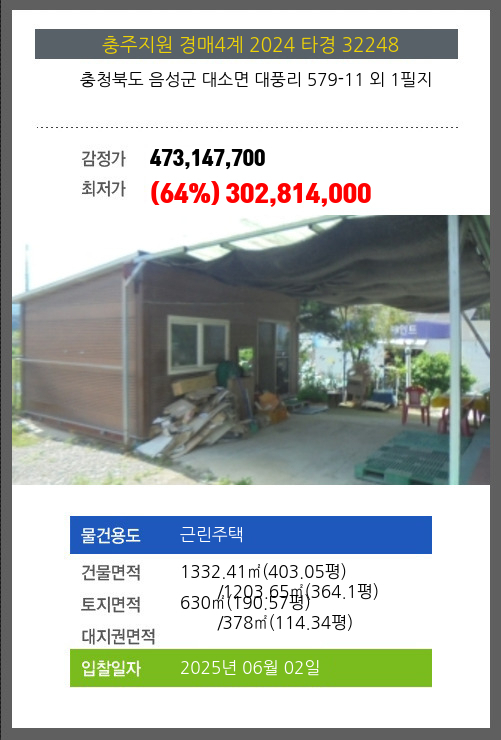 사건번호 2024 타경 32248 본건은 충청북도 음성군 대소면 대풍리 579-11 외 1필지소재하는 근린주택경매 물건의 포스팅입니다. 건물면적 [ 전체:1332.41㎡ (403.05평) 매각지분:1203.65㎡ (364.1평) ]토지면적 [ 전체:630㎡ (190.57평)