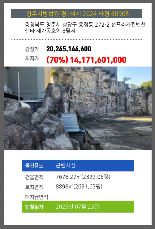 사건번호 2024 타경 60905 본건은 충청북도 청주시 상당구 용정동 272-2 선프라자컨벤션센타 제가동호외 8필지소재하는 근린시설경매 물건의 포스팅입니다. 건물면적 [ 7676.27㎡ (2322.06평) ]토지면적 [ 8898㎡ (2691.63평) ]