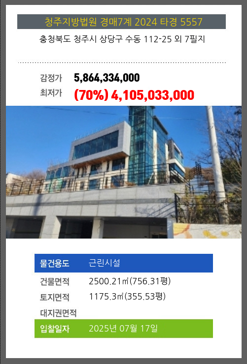 사건번호 2024 타경 5557 본건은 충청북도 청주시 상당구 수동 112-25 외 7필지소재하는 근린시설경매 물건의 포스팅입니다. 건물면적 [ 2500.21㎡ (756.31평) ]토지면적 [ 1175.3㎡ (355.53평) ] 시세를