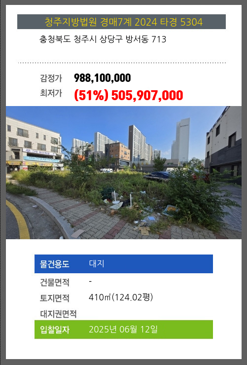 사건번호 2024 타경 5304 본건은 충청북도 청주시 상당구 방서동 713소재하는 대지경매 물건의 포스팅입니다. 토지면적 [ 410㎡ (124.02평) ] 시세를 반영한 감정가 988,100,000에서3회 유찰되어 감정가 대비