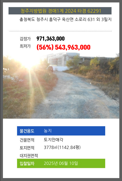 사건번호 2024 타경 62291 본건은 충청북도 청주시 흥덕구 옥산면 소로리 631 외 3필지소재하는 농지경매 물건의 포스팅입니다. 건물면적 [ 토지만매각 ]토지면적 [ 3778㎡ (1142.84평) ] 시세를
