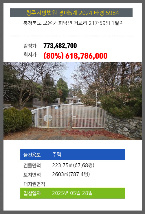 사건번호 2024 타경 5984 본건은 충청북도 보은군 회남면 거교리 217-59외 1필지소재하는 주택경매 물건의 포스팅입니다. 건물면적 [ 223.75㎡ (67.68평) ]토지면적 [ 2603㎡ (787.4평) ] 시세를 반영한