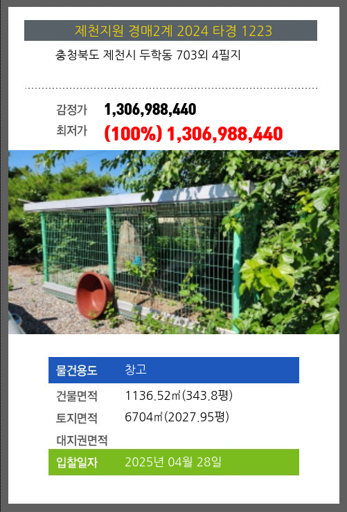 사건번호 2024 타경 1223 본건은 충청북도 제천시 두학동 703외 4필지소재하는 창고경매 물건의 포스팅입니다. 건물면적 [ 1136.52㎡ (343.8평) ]토지면적 [ 6704㎡ (2027.95평) ] 시세를 반영한 감정가