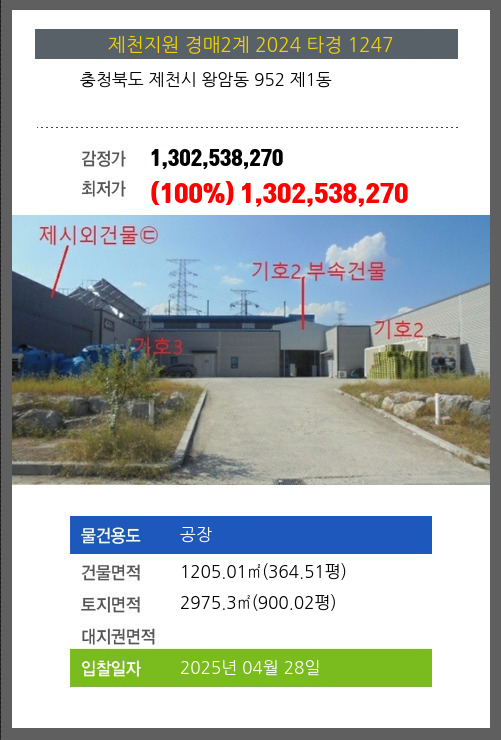 사건번호 2024 타경 1247 본건은 충청북도 제천시 왕암동 952 제1동소재하는 공장경매 물건의 포스팅입니다. 건물면적 [ 1205.01㎡ (364.51평) ]토지면적 [ 2975.3㎡ (900.02평) ] 시세를 반영한 감정가