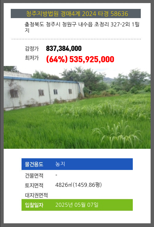 사건번호 2024 타경 58636 본건은 충청북도 청주시 청원구 내수읍 초정리 327-2외 1필지소재하는 농지경매 물건의 포스팅입니다. 토지면적 [ 4826㎡ (1459.86평) ] 시세를 반영한 감정가 837,384,000에서2회 유찰되어