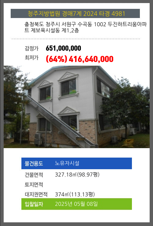 사건번호 2024 타경 4981 본건은 충청북도 청주시 서원구 수곡동 1002 두진하트리움아파트 제보육시설동 제1,2층소재하는 노유자시설경매 물건의 포스팅입니다. 건물면적 [ 327.18㎡ (98.97평) ]대지권 [ 374㎡ (113.13평) ]