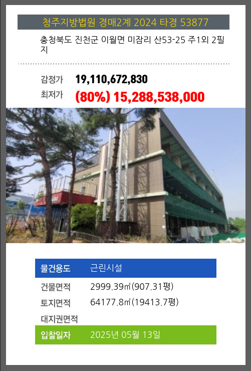 사건번호 2024 타경 53877 본건은 충청북도 진천군 이월면 미잠리 산53-25 주1외 2필지소재하는 근린시설경매 물건의 포스팅입니다. 건물면적 [ 2999.39㎡ (907.31평) ]토지면적 [ 64177.8㎡ (19413.7평) ] 시세를