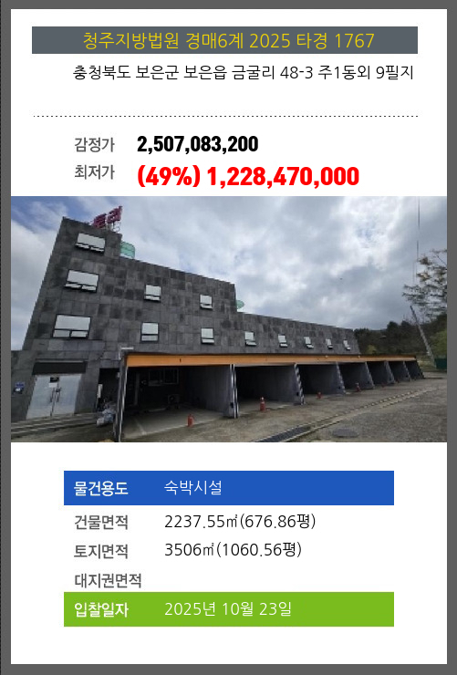 사건번호 2025 타경 1767 본건은 충청북도 보은군 보은읍 금굴리 48-3 주1동외 9필지소재하는 숙박시설경매 물건의 포스팅입니다. 건물면적 [ 2237.55㎡ (676.86평) ]토지면적 [ 3506㎡ (1060.56평) ] 시세를