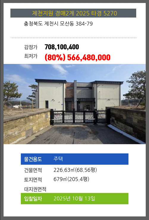 사건번호 2025 타경 5270 본건은 충청북도 제천시 모산동 384-79소재하는 주택경매 물건의 포스팅입니다. 건물면적 [ 226.63㎡ (68.56평) ]토지면적 [ 679㎡ (205.4평) ] 시세를 반영한 감정가 708,100,400에서1회