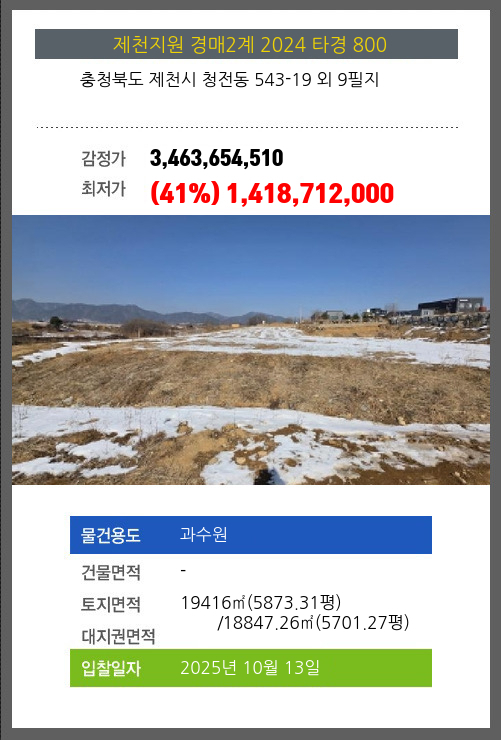 사건번호 2024 타경 800 본건은 충청북도 제천시 청전동 543-19 외 9필지소재하는 과수원경매 물건의 포스팅입니다. 토지면적 [ 전체:19416㎡ (5873.31평) 매각지분:18847.26㎡ (5701.27평) ] 시세를 반영한 감정가 3,463,654,510에서4회