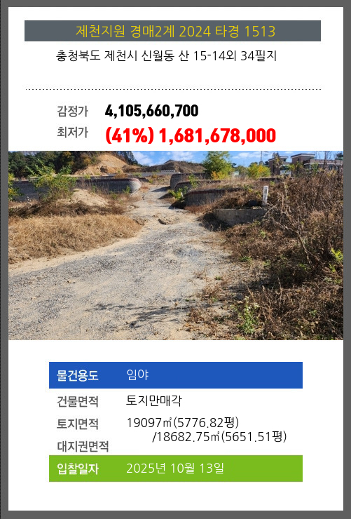 사건번호 2024 타경 1513 본건은 충청북도 제천시 신월동 산 15-14외 34필지소재하는 임야경매 물건의 포스팅입니다. 건물면적 [ 토지만매각 ]토지면적 [ 전체:19097㎡ (5776.82평) 매각지분:18682.75㎡ (5651.51평) ] 시세를