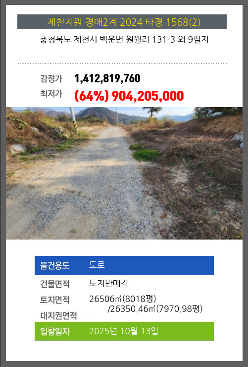 사건번호 2024 타경 1568(2) 본건은 충청북도 제천시 백운면 원월리 131-3 외 9필지소재하는 도로경매 물건의 포스팅입니다. 건물면적 [ 토지만매각 ]토지면적 [ 전체:26506㎡ (8018평) 매각지분:26350.46㎡ (7970.98평) ]