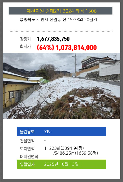 사건번호 2024 타경 1506 본건은 충청북도 제천시 신월동 산 15-38외 20필지소재하는 임야경매 물건의 포스팅입니다. 토지면적 [ 전체:11223㎡ (3394.94평) 매각지분:5486.25㎡ (1659.58평) ] 시세를 반영한 감정가 1,677,835,750에서2회