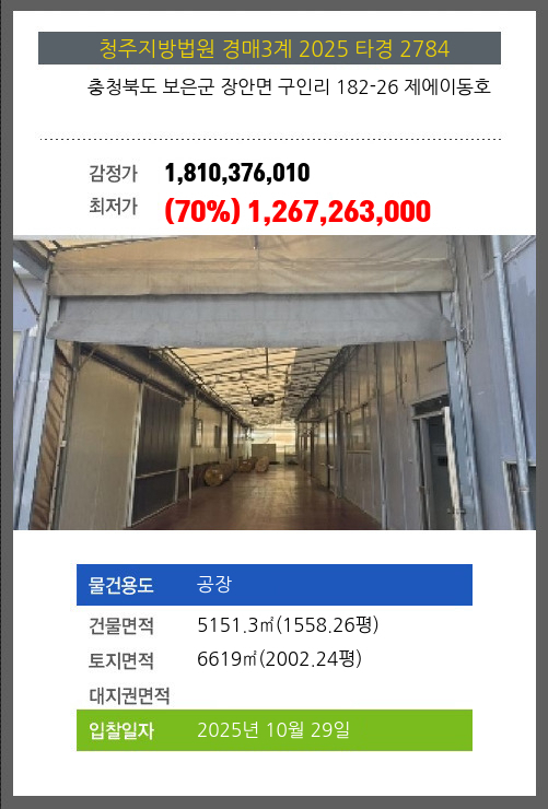 사건번호 2025 타경 2784 본건은 충청북도 보은군 장안면 구인리 182-26 제에이동호소재하는 공장경매 물건의 포스팅입니다. 건물면적 [ 5151.3㎡ (1558.26평) ]토지면적 [ 6619㎡ (2002.24평) ] 시세를 반영한