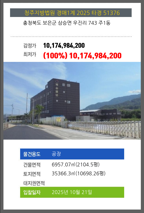 사건번호 2025 타경 51376 본건은 충청북도 보은군 삼승면 우진리 743 주1동소재하는 공장경매 물건의 포스팅입니다. 건물면적 [ 6957.07㎡ (2104.5평) ]토지면적 [ 35366.3㎡ (10698.26평) ] 시세를 반영한