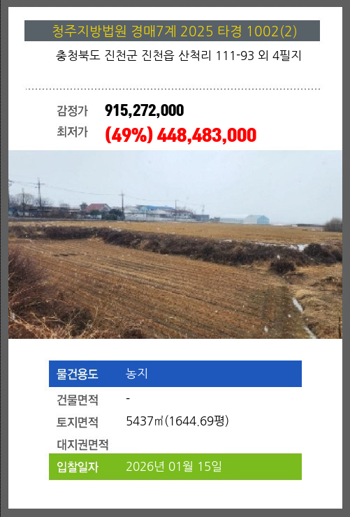 사건번호 2025 타경 1002(2) 본건은 충청북도 진천군 진천읍 산척리 111-93 외 4필지소재하는 농지경매 물건의 포스팅입니다. 토지면적 [ 5437㎡ (1644.69평) ] 시세를 반영한 감정가 915,272,000에서2회 유찰되어