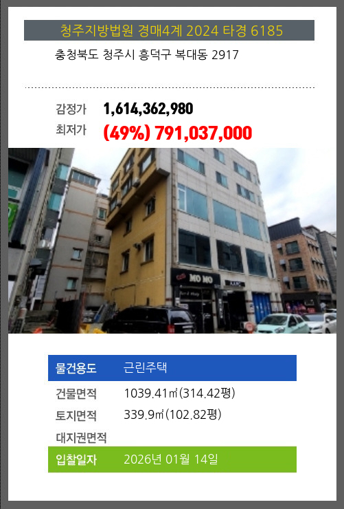 사건번호 2024 타경 6185 본건은 충청북도 청주시 흥덕구 복대동 2917소재하는 근린주택경매 물건의 포스팅입니다. 건물면적 [ 1039.41㎡ (314.42평) ]토지면적 [ 339.9㎡ (102.82평) ] 시세를 반영한 감정가
