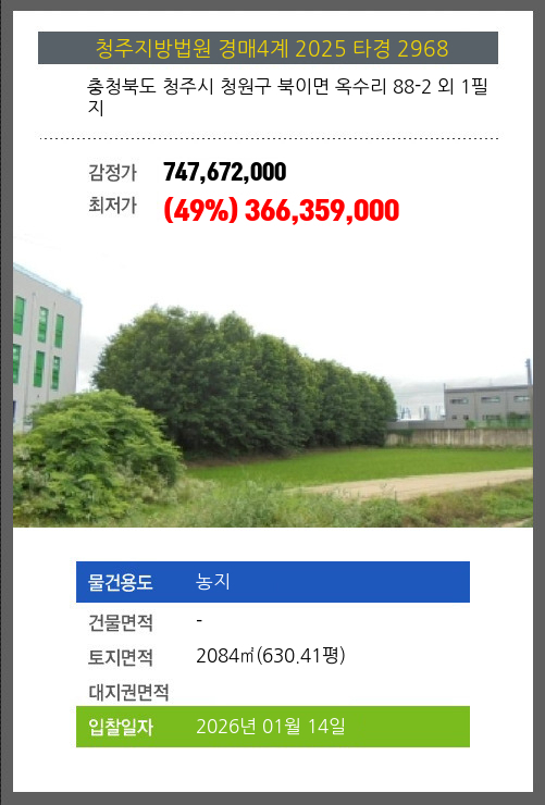 사건번호 2025 타경 2968 본건은 충청북도 청주시 청원구 북이면 옥수리 88-2 외 1필지소재하는 농지경매 물건의 포스팅입니다. 토지면적 [ 2084㎡ (630.41평) ] 시세를 반영한 감정가 747,672,000에서2회