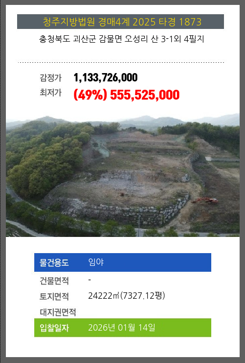 사건번호 2025 타경 1873 본건은 충청북도 괴산군 감물면 오성리 산 3-1외 4필지소재하는 임야경매 물건의 포스팅입니다. 토지면적 [ 24222㎡ (7327.12평) ] 시세를 반영한 감정가 1,133,726,000에서2회 유찰되어