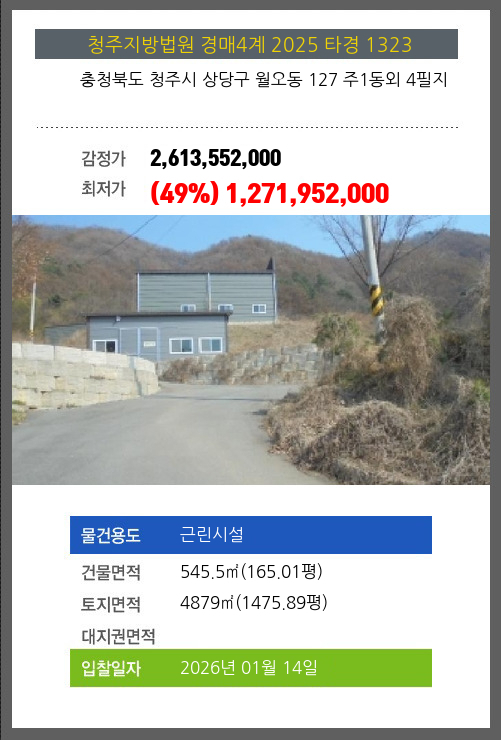 사건번호 2025 타경 1323 본건은 충청북도 청주시 상당구 월오동 127 주1동외 4필지소재하는 근린시설경매 물건의 포스팅입니다. 건물면적 [ 545.5㎡ (165.01평) ]토지면적 [ 4879㎡ (1475.89평) ] 시세를
