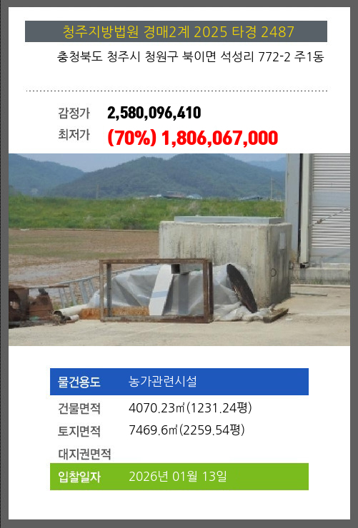 사건번호 2025 타경 2487 본건은 충청북도 청주시 청원구 북이면 석성리 772-2 주1동소재하는 농가관련시설경매 물건의 포스팅입니다. 건물면적 [ 4070.23㎡ (1231.24평) ]토지면적 [ 7469.6㎡ (2259.54평) ] 시세를
