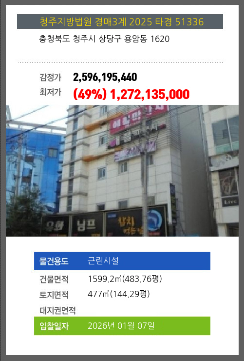 사건번호 2025 타경 51336 본건은 충청북도 청주시 상당구 용암동 1620소재하는 근린시설경매 물건의 포스팅입니다. 건물면적 [ 1599.2㎡ (483.76평) ]토지면적 [ 477㎡ (144.29평) ] 시세를 반영한 감정가