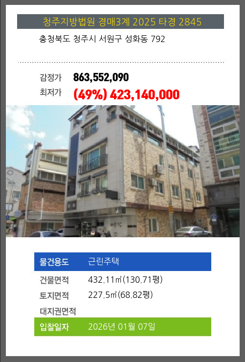 사건번호 2025 타경 2845 본건은 충청북도 청주시 서원구 성화동 792소재하는 근린주택경매 물건의 포스팅입니다. 건물면적 [ 432.11㎡ (130.71평) ]토지면적 [ 227.5㎡ (68.82평) ] 시세를 반영한 감정가