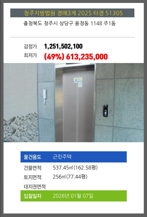 사건번호 2025 타경 51305 본건은 충청북도 청주시 상당구 용정동 1148 주1동소재하는 근린주택경매 물건의 포스팅입니다. 건물면적 [ 537.45㎡ (162.58평) ]토지면적 [ 256㎡ (77.44평) ] 시세를 반영한