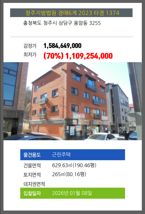 사건번호 2023 타경 1374 본건은 충청북도 청주시 상당구 용암동 3255소재하는 근린주택경매 물건의 포스팅입니다. 건물면적 [ 629.63㎡ (190.46평) ]토지면적 [ 265㎡ (80.16평) ] 시세를 반영한 감정가